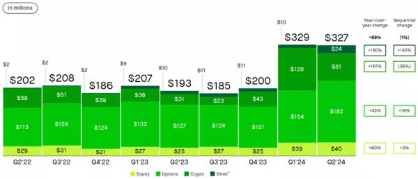 Онлайн-брокер Robinhood за підсумками квітня-червня зафіксував дохід від торгівлі криптовалютами в розмірі $81 млн. Показник підскочив на 161% щодо другого кварталу минулого року і вдвічі перевищив пов’язану з акціями метрику ($40 млн).