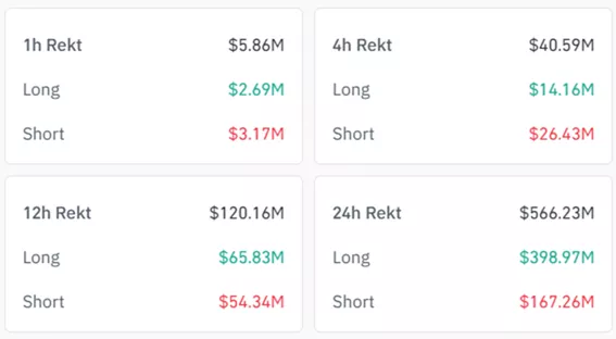 За даними Coinglass, за останні 24 години ліквідації зазнали 217 538 позицій трейдерів на $566 млн, з яких $399 млн припали на лонги.