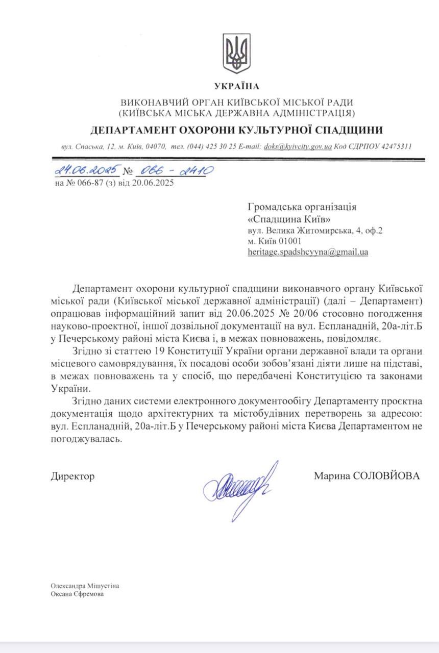 «У відповіді на офіційний запит Департамент охорони культурної спадщини КМДА вказав, що жодної науково-проектної документації за цією адресою він не погоджував, дозволу на проведення робіт не надавав», — написав Дмитро Перов.